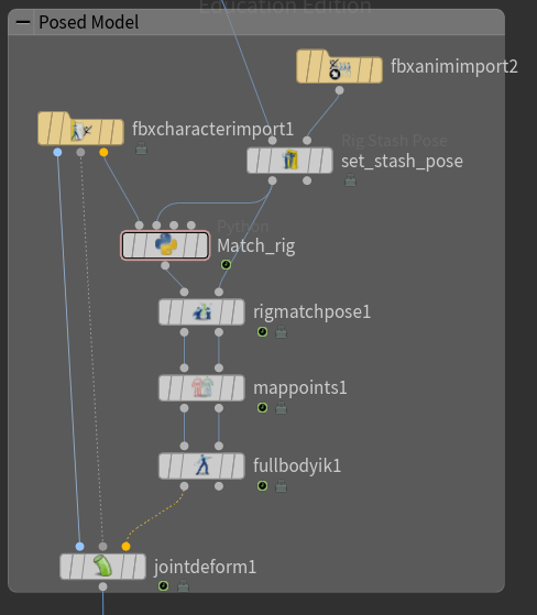Next, when the user inputs their rigged model into the system, Python code automatically scans the entire rig and attempts to match its bones to the internal rig. This is done by setting values on the Houdini Map Points node based on commonly used bone names such as "head," "spine," "hand," and so on. While this automated matching works well in most cases, inconsistencies in naming may lead to occasional mismatches. If that happens, the user can manually adjust the bone mappings to correct any issues.