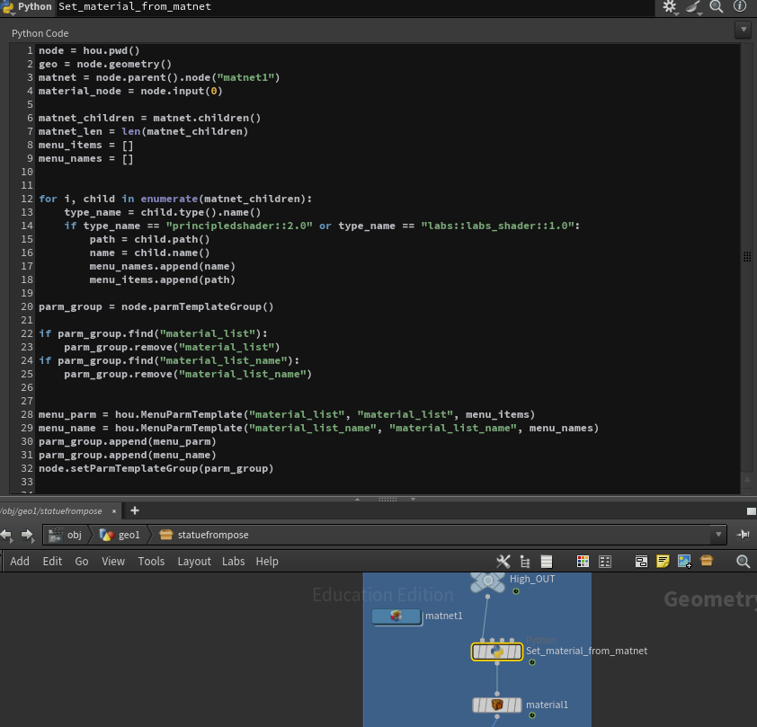 First, the rigged model and materials are automatically added to the UI using Python code. When additional materials and pose options are added to the system, they will appear in their corresponding lists for the user.