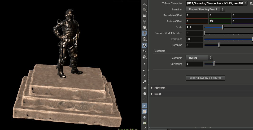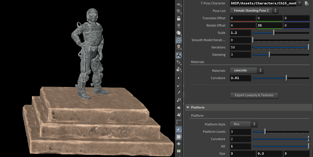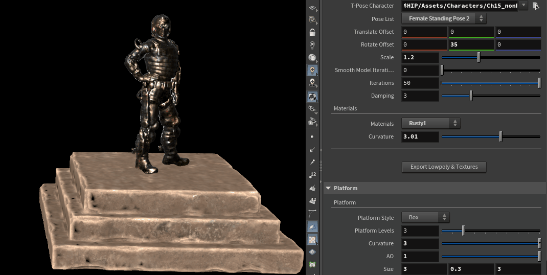 In this project, I developed a tool over the course of three weeks (part-time) that allows users to first input their own rigged characters and then generate statue-like outputs with predefined poses and materials.
