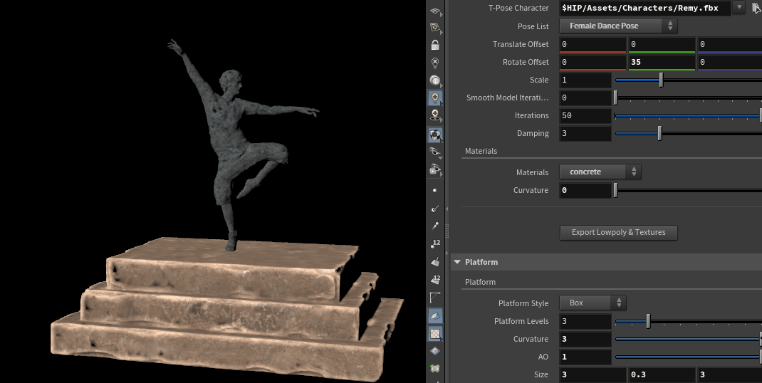 Lastly, I added options for generating a procedural platform. Nothing too complex, just some basic shapes copied in an array, combined using VDB operations, with texture options like curvature and ambient occlusion.